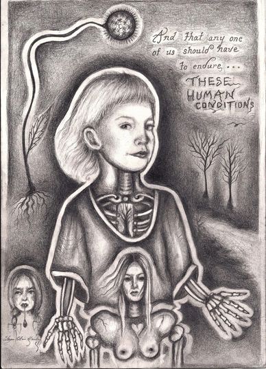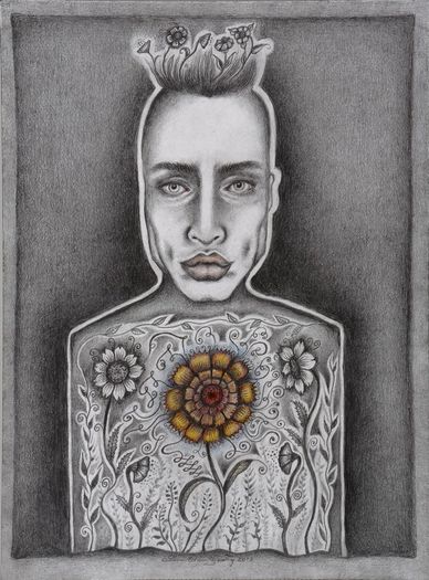 Blossoming. Graphite, Charcoal, Colored Pencil and Ink.