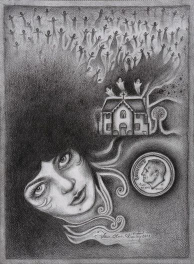Haunted on the Turn of a Dime. Graphite, Charcoal, Colored Pencil and Ink.