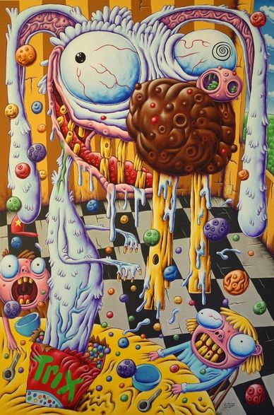 If we had access to acid when we were busily shoveling sugary cereal into our PJ clad carcusses on Saturday mornings; if we think back to those childhood memories through the lens of our post 2020 experiences; if we look at ourselves, in the harshest of flickering fluorescent barroom bathroom stall reflections at 11:56 on a Tuesday night: the artwork of shawn g pacheco.